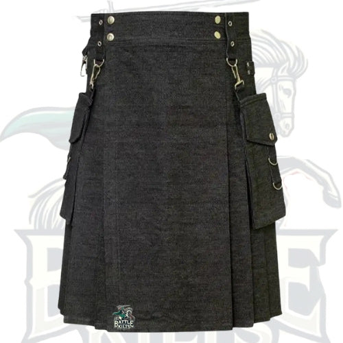 Upgrade your wardrobe with the rugged and versatile Black Denim Utility Kilt for Men by Battle of Kilts. Designed for strength, comfort, and practicality, this kilt is crafted from durable black denim that holds up to daily wear while delivering bold, modern style. Featuring spacious utility pockets and sturdy hardware, it’s the perfect choice for festivals, outdoor adventures, casual gatherings, or work environments where comfort meets style. At Battle of Kilts, we blend tradition with innovation, creating kilts that let you express your heritage while standing out with confidence. Whether for casual use or statement wear, this utility kilt is built to last.