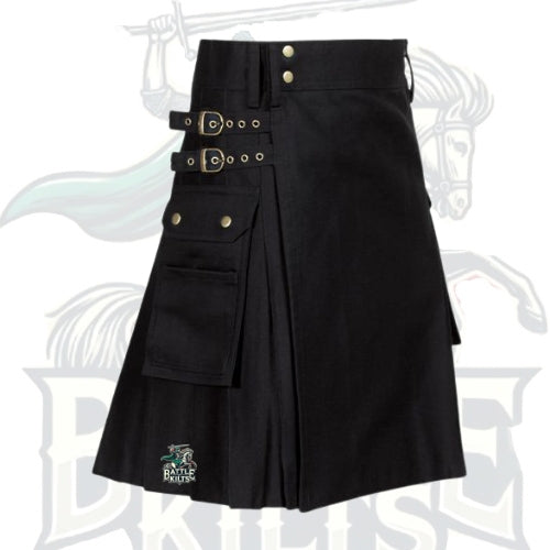 Upgrade your wardrobe with the BattleOfKilts Black Utility Kilt with Flap Pockets and Buckle Strap—where style meets practicality!