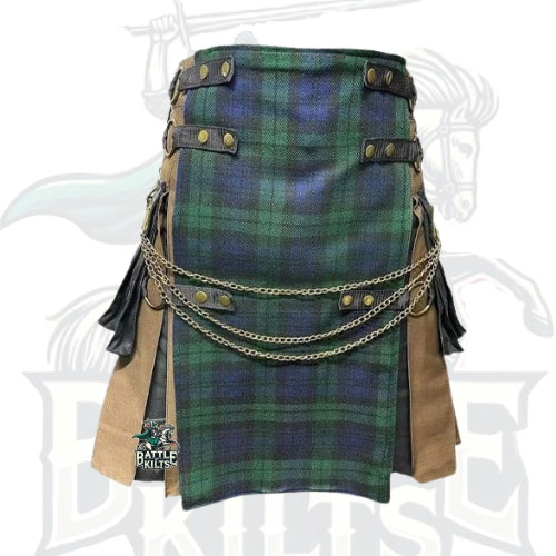 The Brown and Black Gothic Hybrid Utility Kilt with Black Watch Tartan Apron is not just Highland wear—it’s a statement of strength, heritage, and individuality.