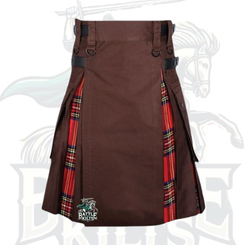 Stand out with a bold mix of tradition and modernity in the Brown & Royal Stewart Hybrid Tartan Kilt, expertly crafted by BattleOfKilts, a trusted brand in premium Scottish kilts. This kilt blends the timeless elegance of the Royal Stewart tartan with earthy brown fabric panels, creating a striking and versatile hybrid design that is perfect for Highland games, cultural events, gothic fashion, or everyday wear.