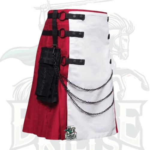Make a striking statement with the Burgundy and White Gothic Kilt with Black Pockets, expertly crafted by BattleOfKilts, a trusted brand known for premium kilts and hybrid designs. Perfect for casual wear, gothic events, festivals, concerts, or Highland-inspired occasions, this utility kilt combines bold burgundy and white styling with practical black pockets, creating a modern, edgy, and versatile look.