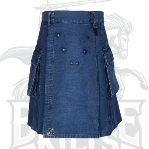 Turn heads with the bold and stylish Fashion Blue Denim Kilt with Studs by Battle of Kilts. Crafted from premium blue denim, this kilt is designed for men who want to stand out with confidence. The addition of metal studs gives it a rugged, edgy look while maintaining comfort and versatility. Perfect for concerts, festivals, parties, or casual streetwear, this denim kilt blends heritage-inspired design with modern fashion flair. Durable, comfortable, and uniquely stylish, it’s a must-have for anyone looking to redefine traditional kilt style with a contemporary twist. Battle of Kilts delivers quality craftsmanship in every detail.