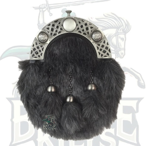Made from premium black rabbit fur and a genuine leather back, this sporran offers luxurious texture and durability. The Celtic cantle features intricate knotwork, symbolizing unity, eternity, and strength, while the domed shield accent adds a distinguished, ceremonial touch. The three decorative fur tassels complete the authentic Highland look, balancing elegance with traditional design.