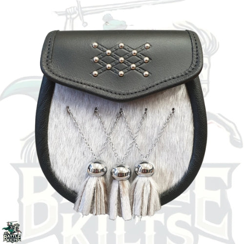 The sporran features three grey seal fur tassels suspended from decorative chains, adding traditional Highland flair and elegant movement. A secure snap fastening ensures your essentials are safely stored, while the included adjustable chain strap allows comfortable and authentic wear at the front of your kilt.