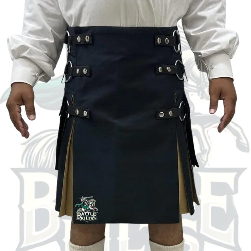 Crafted from premium 100% cotton, this hybrid kilt combines a matte black outer layer with khaki inner pleats, creating a striking contrast that reflects strength and individuality. The design includes deep cargo pockets, offering ample storage for your essentials, while adjustable leather straps with chrome buckles ensure a comfortable, secure fit tailored to your body.