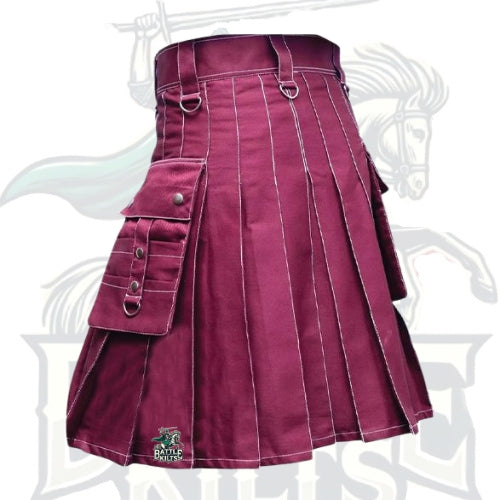 Stand out with bold contrast in the BattleOfKilts Maroon Utility Kilt with White Outer Thread, a perfect blend of rugged functionality and modern Scottish style. The deep maroon color paired with striking white outer stitching gives this kilt a unique, eye-catching finish that enhances its contemporary design.