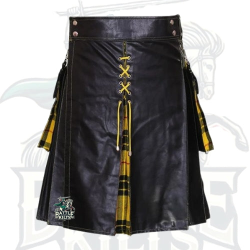 This hybrid kilt features authentic MacLeod of Lewis pleats in classic tartan pattern, paired with high-quality black leather, creating a striking contrast that’s both traditional and contemporary. The leather construction ensures durability, long-lasting wear, and a sleek, stylish appearance. Expertly tailored pleats maintain structure and elegance, while functional elements—such as adjustable leather straps, reinforced stitching, and secure pockets—make it practical for active lifestyles. Whether attending a Highland festival, casual outing, or social event, this kilt balances heritage with utility effortlessly.