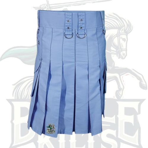 Elevate your wardrobe with the BattleOfKilts Men’s Light Blue Cargo Kilt—where utility meets contemporary Scottish tradition.