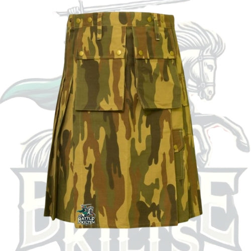 Embrace rugged, tactical style with the Military Camouflage Kilt by Battle of Kilts. Handmade from premium durable materials, this utility kilt combines military-inspired camouflage aesthetics with practical design. Featuring adjustable straps and functional pockets, it provides a secure, comfortable fit and convenient storage for festivals, cosplay, outdoor adventures, or casual wear. Each piece is meticulously handcrafted with reinforced stitching and attention to detail, reflecting the superior craftsmanship that defines Battle of Kilts. Ideal for men who value durability, style, and functionality in one versatile kilt.