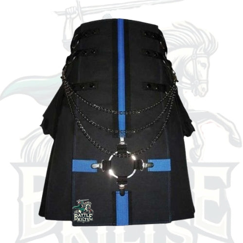 Elevate your look with the BattleOfKilts Modern Black Gothic Utility Kilt with Blue Straps—a true blend of attitude, versatility, and Scottish heritage.