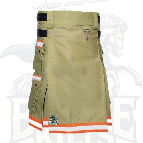 Step into strength and style with the Modern Khaki Bunker Gear Firefighter Kilt by Battle of Kilts. Inspired by traditional firefighter bunker gear, this kilt is handmade from durable, premium-quality fabric for long-lasting wear. It features reflective trim for added visibility, spacious utility pockets for functionality, and adjustable straps for a secure, comfortable fit. Perfect for festivals, cosplay, themed events, parades, or casual wear, this kilt combines rugged firefighter-inspired style with modern practicality. Crafted with reinforced stitching and attention to detail, it’s a true statement piece from Battle of Kilts.