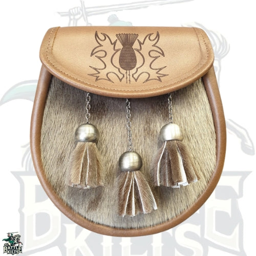 The Norwood Sporran Thistle Etched Brown Leather with Grey Seal Fur is a masterfully crafted Highland accessory that combines authentic Scottish tradition with luxurious detailing. Handmade by BattleOfKilts, this sporran is perfect for formal occasions, weddings, ceilidhs, and clan gatherings, offering a refined look that complements both classic and modern kilt outfits.