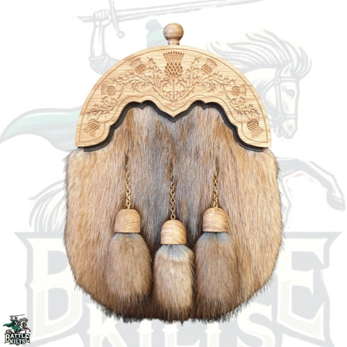Constructed from premium musquash fur and high-quality leather, this sporran features a soft, luxurious texture with natural variations, ensuring each piece is unique. The front flap is adorned with an oak thistle cantle, intricately designed in fine metalwork to reflect Scotland’s heritage, adding a distinguished and traditional touch to your attire. Designed in a full-dress style, this sporran is ideal for ceremonial and formal Highland wear, providing a polished and refined appearance.
