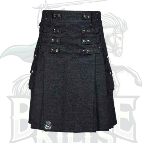 Make a bold statement with the Scottish Black Denim Kilt with Stylish Apron by Battle of Kilts. Crafted from premium black denim, this kilt combines traditional Scottish design with a modern twist. The attached stylish apron adds both flair and practicality, making it perfect for cultural events, casual outings, or festivals. Designed for comfort, durability, and effortless style, this kilt embodies the perfect balance between heritage and contemporary fashion. Every piece reflects the exceptional craftsmanship and attention to detail that define Battle of Kilts.