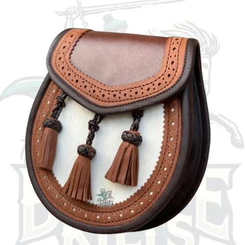 Made from 100% genuine brown leather, this sporran features a durable, high-quality finish with natural texture and character. Its three-tassel design enhances traditional Highland style, offering dynamic movement and ceremonial elegance while complementing any formal kilt outfit. The full-dress style ensures it is ideal for ceremonial and formal Highland attire, providing a polished and distinguished appearance.