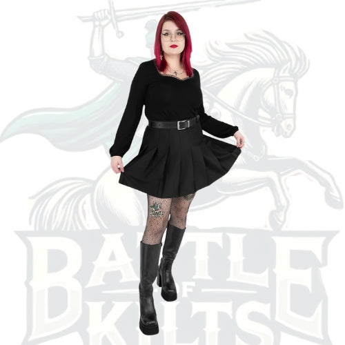 Stay stylish and comfortable on and off the court with the Battle of Kilts Women’s Black Tennis Skirt. Crafted from high-quality, breathable fabric, this skirt ensures maximum comfort and freedom of movement. The flattering mid-rise fit and sleek design make it perfect for sports, casual outings, or sporty-chic looks. Pair it with your favorite tops, sneakers, or accessories for a versatile, modern outfit that combines performance with style.